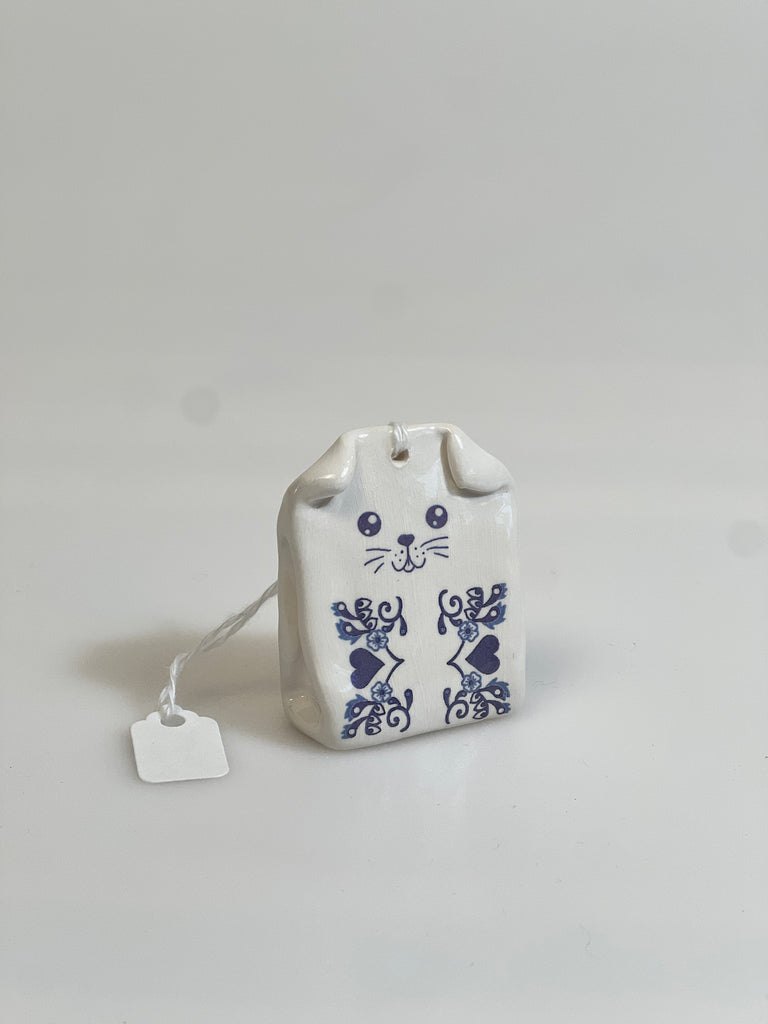These little teabag tinkers are made from white earthenware clay and adorned mostly with the blue willow pattern.