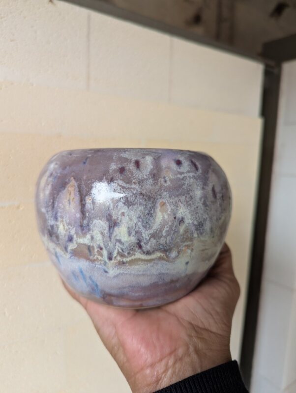 Decorated with lilac matt inside, then indigo rain, lavender mist and galaxy glaze.