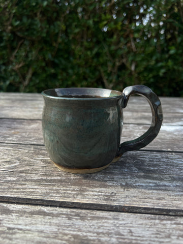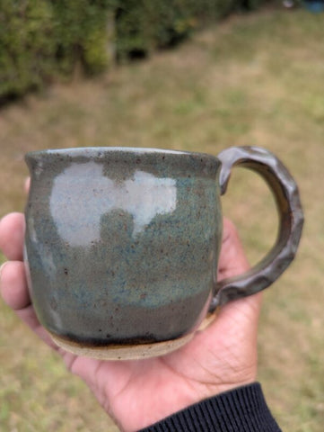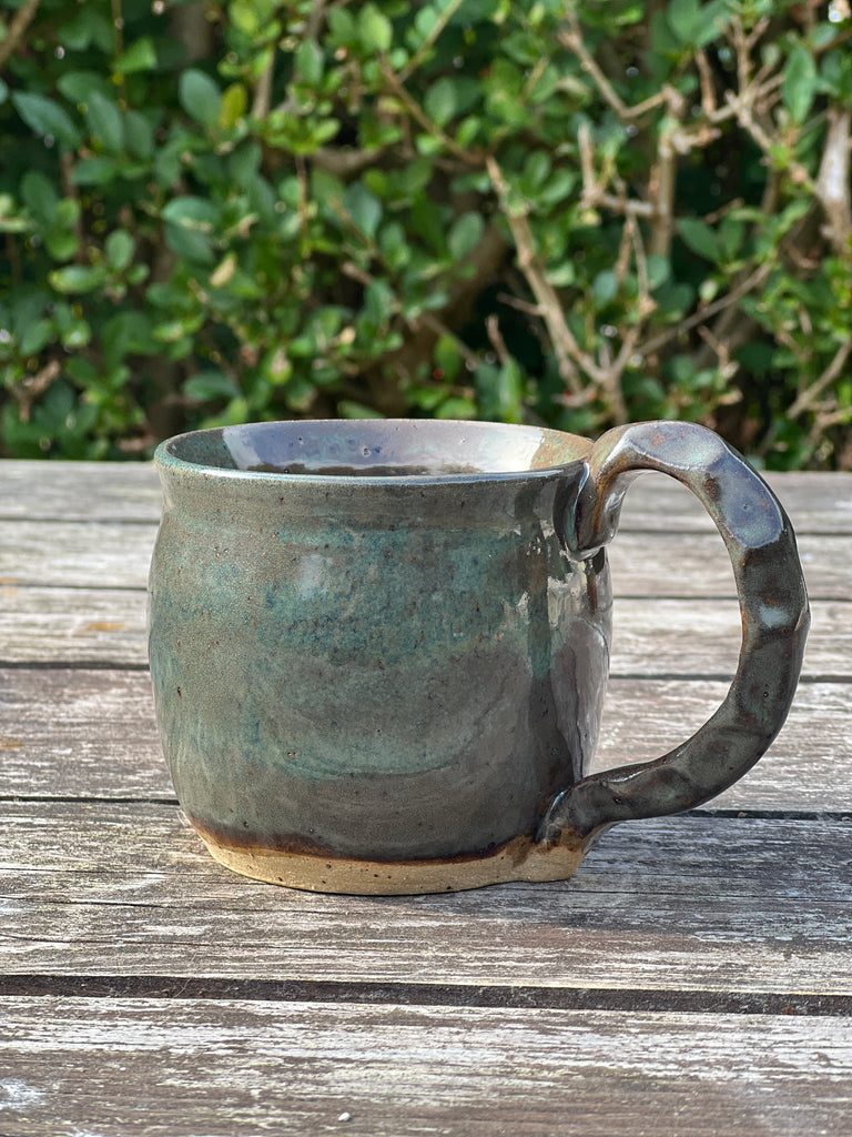 Hand thrown speckled stoneware clay mug with a chunky handle.